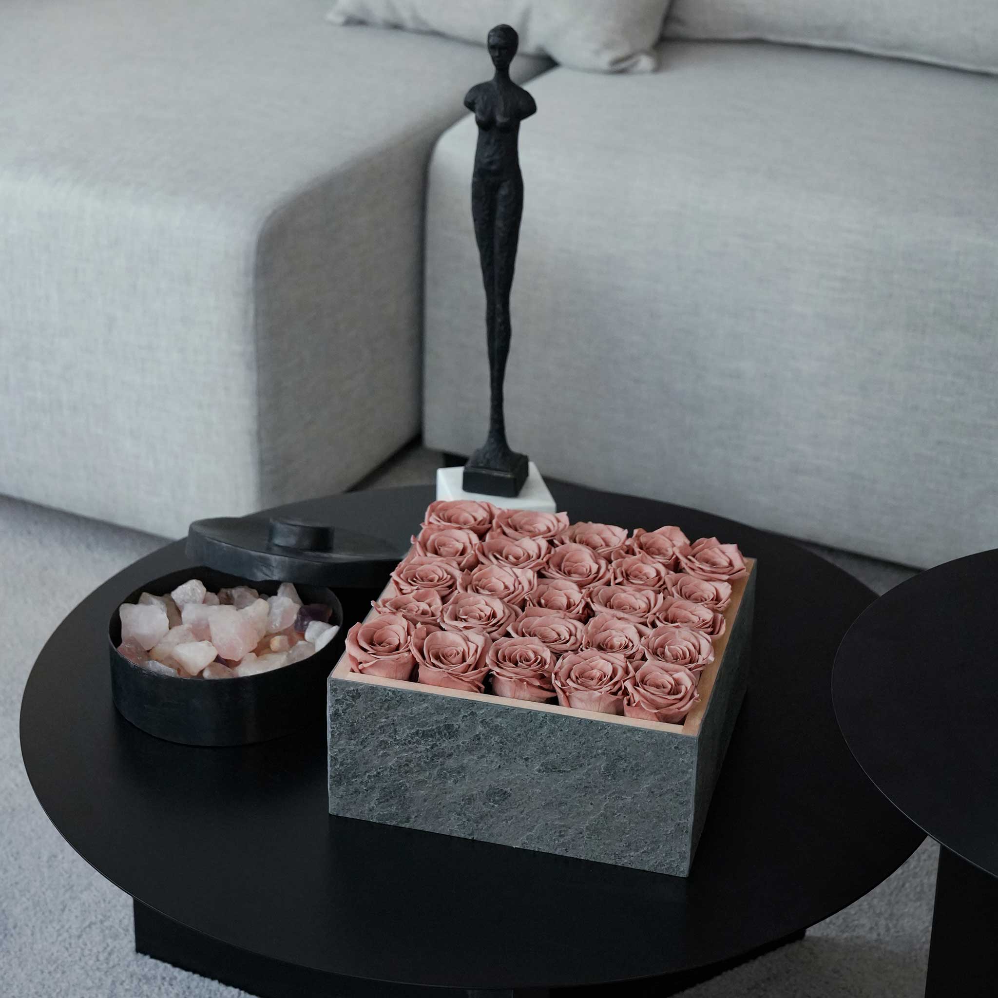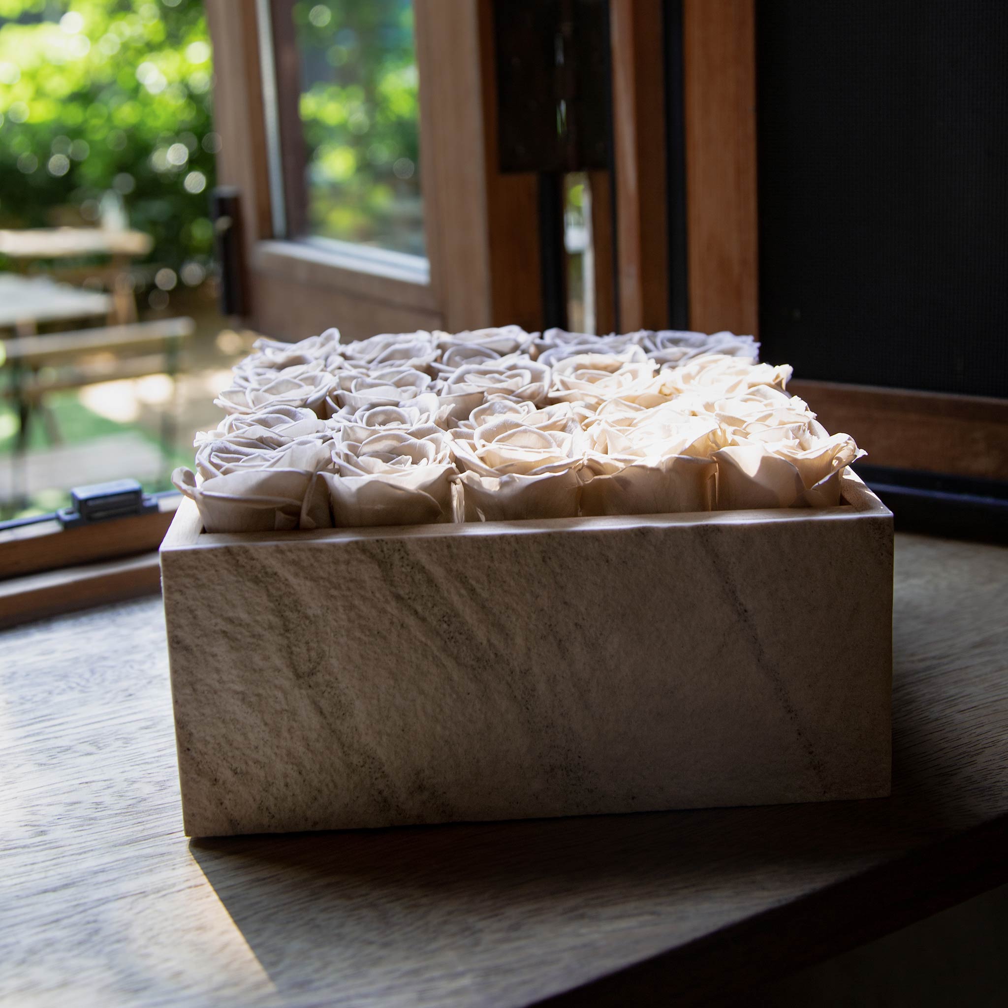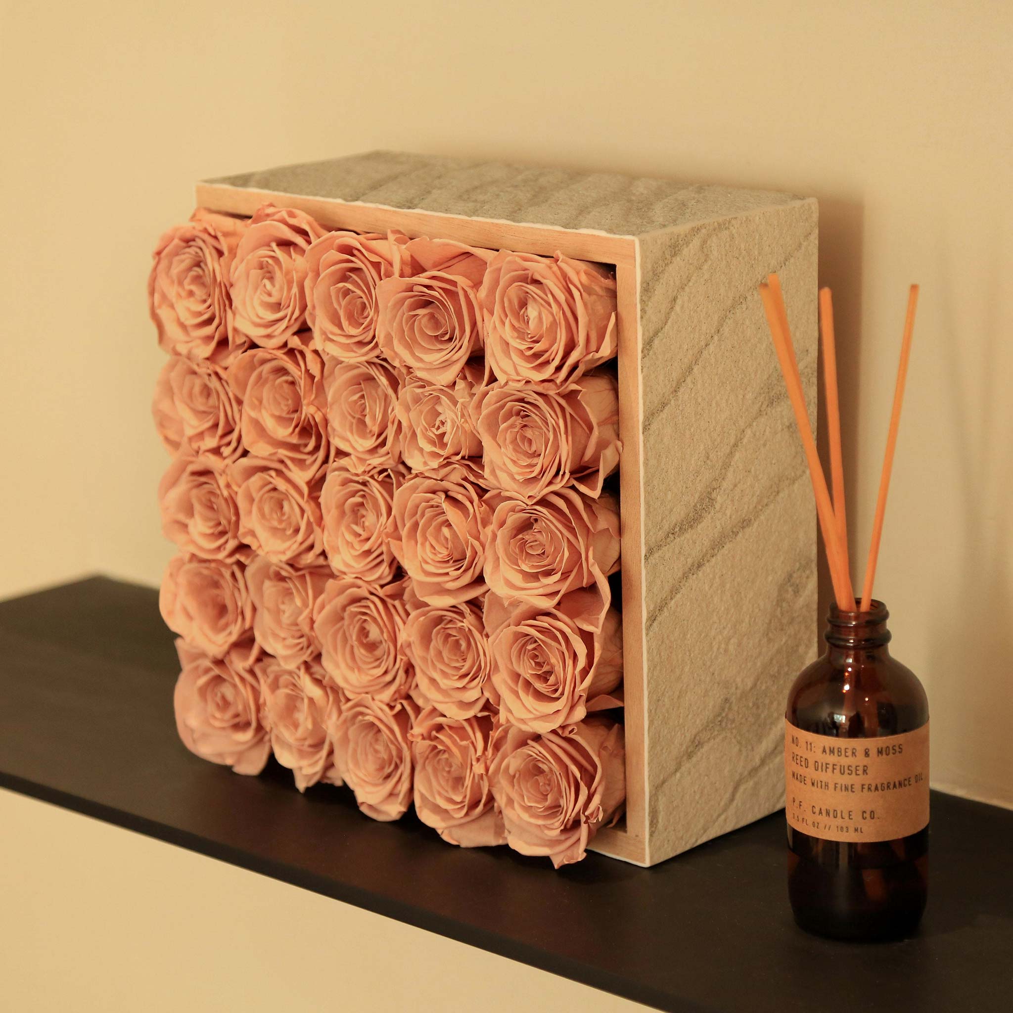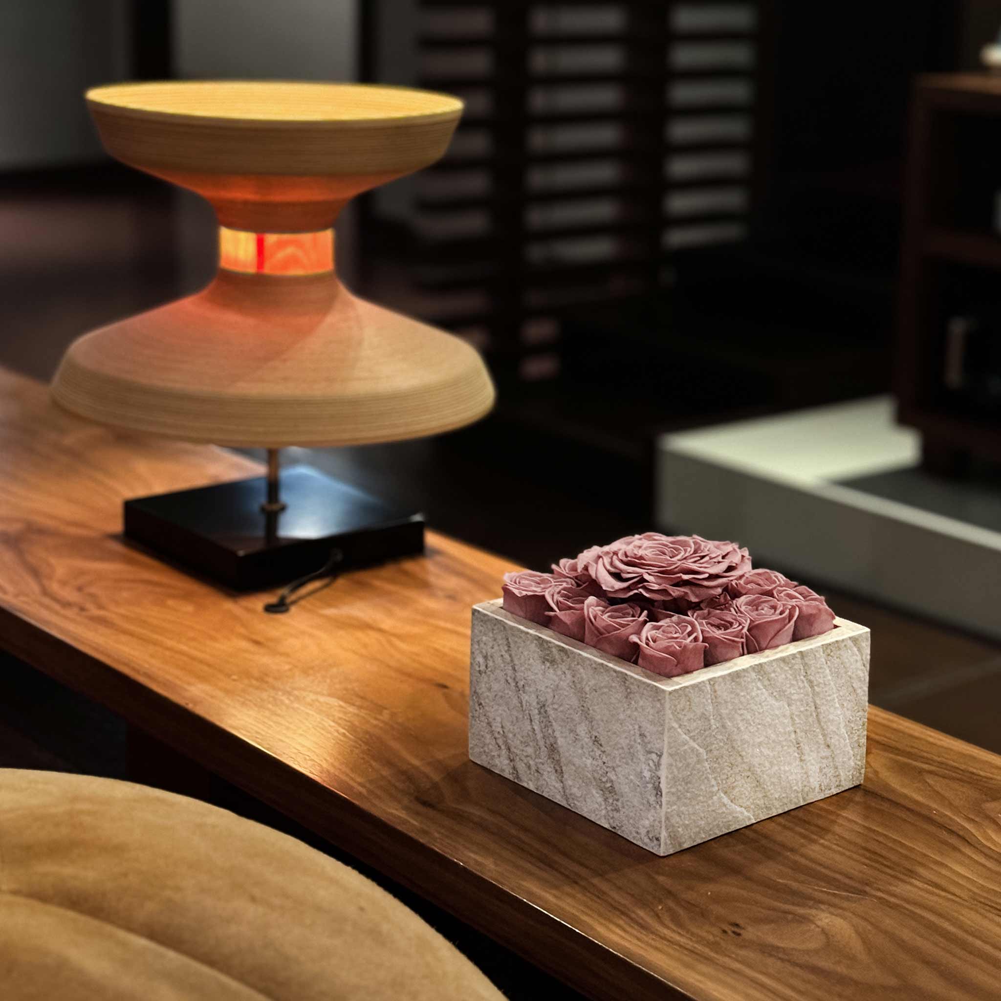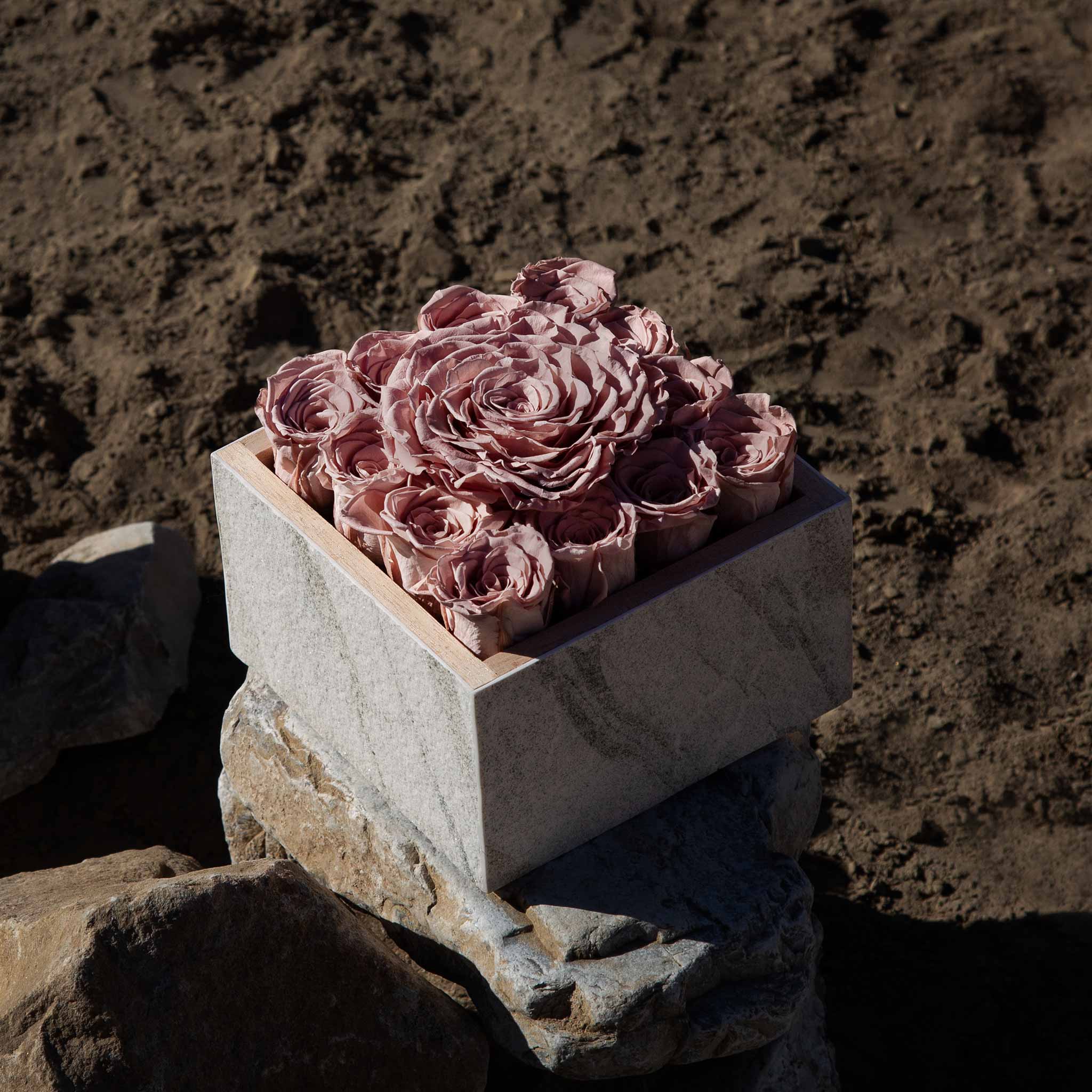 The Pāsāna Collection is an artistic confluence of three pieces of nature: a rose centerpiece, a wooden vessel and a stone facade.