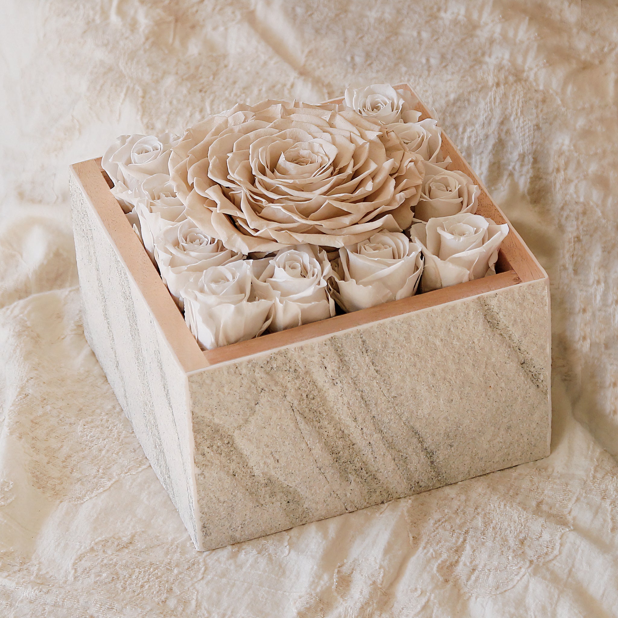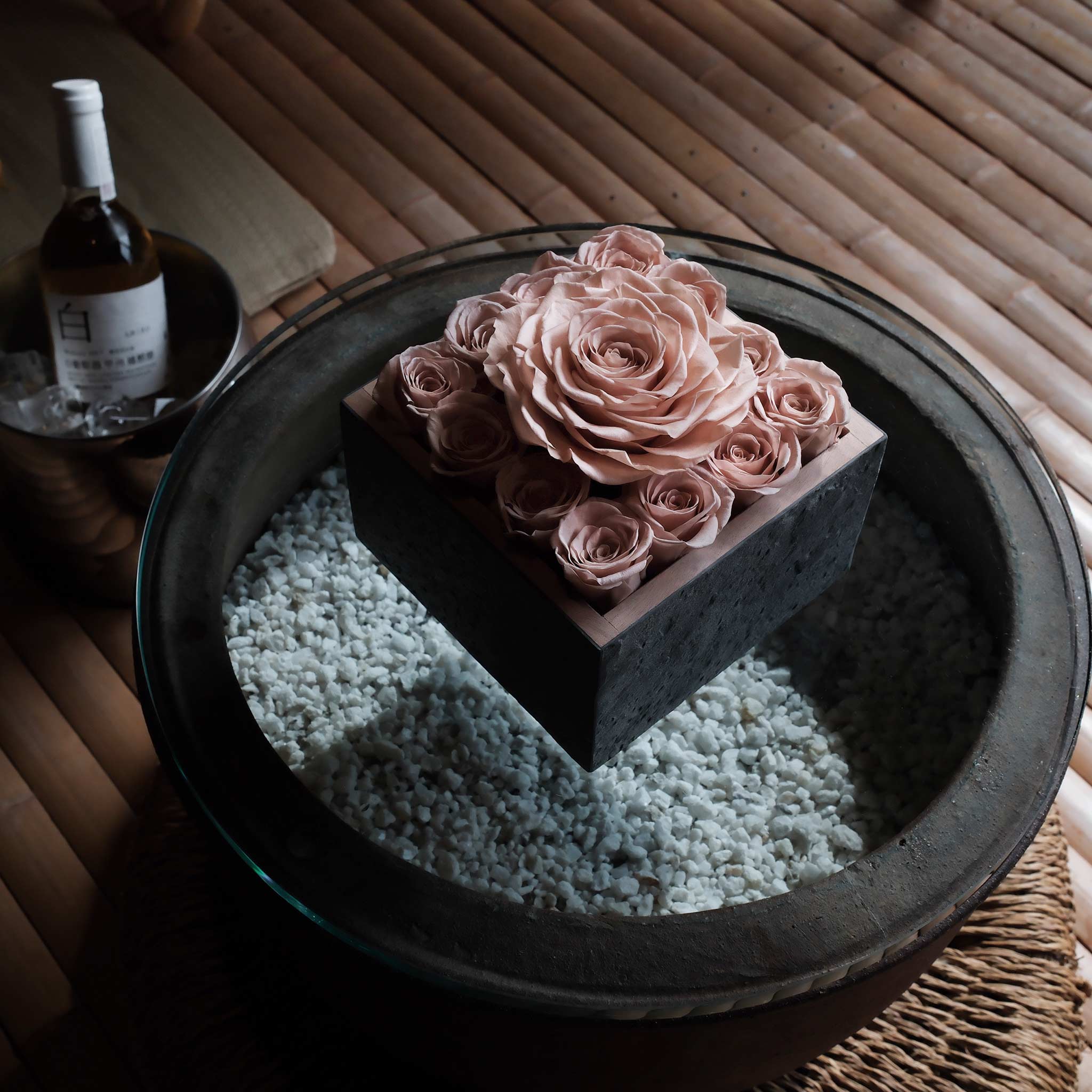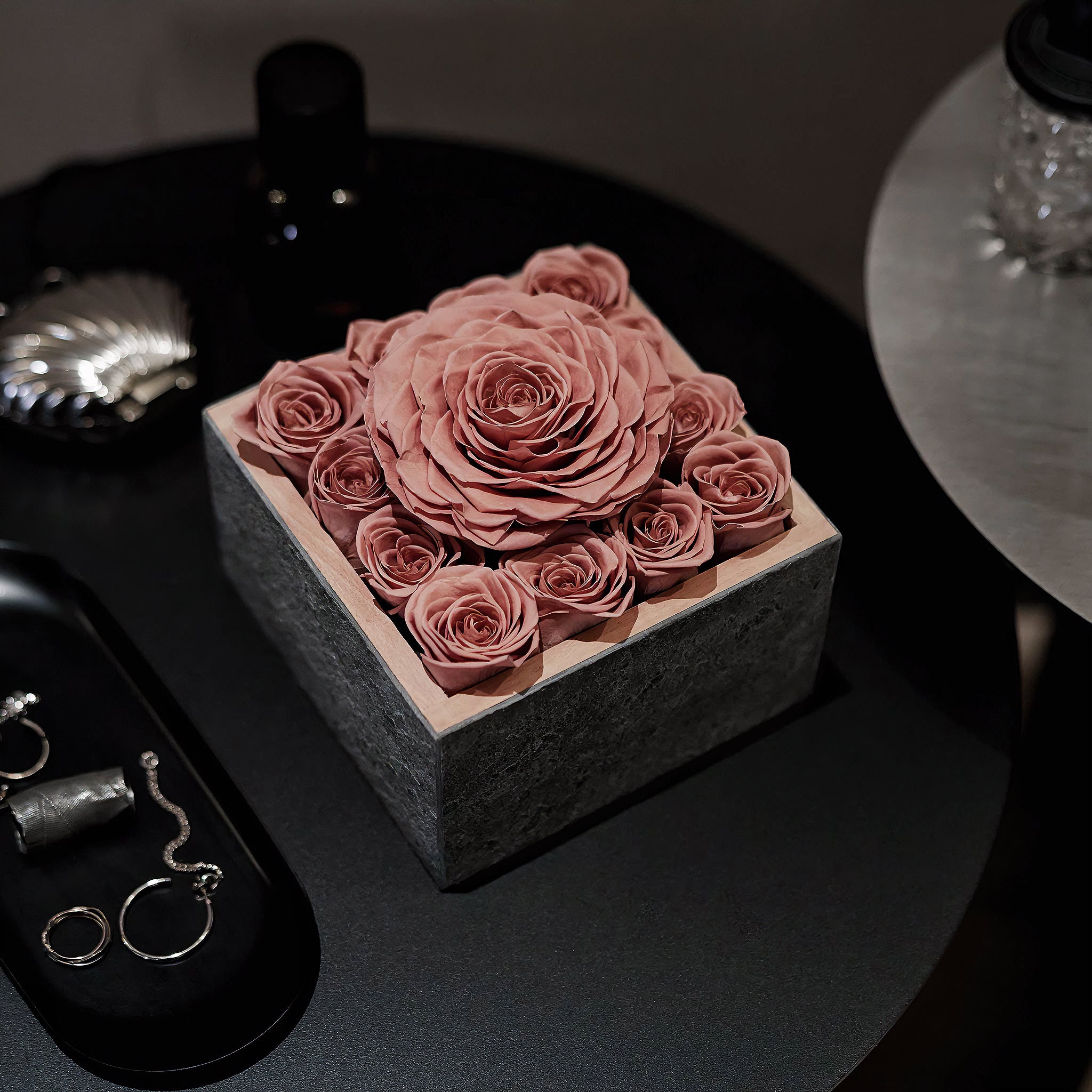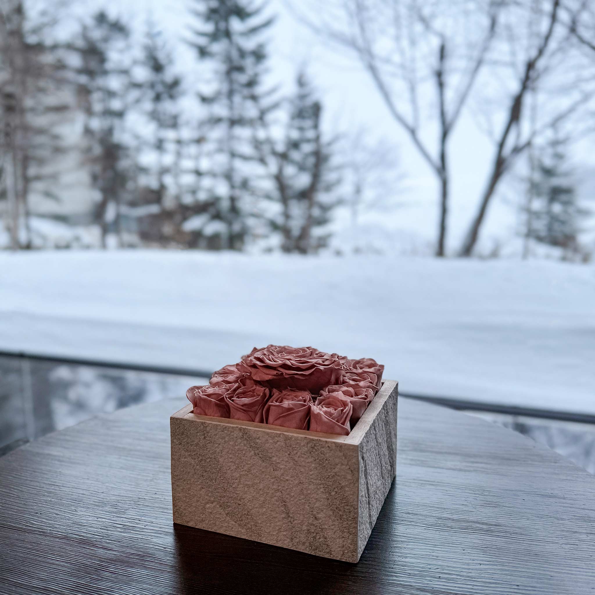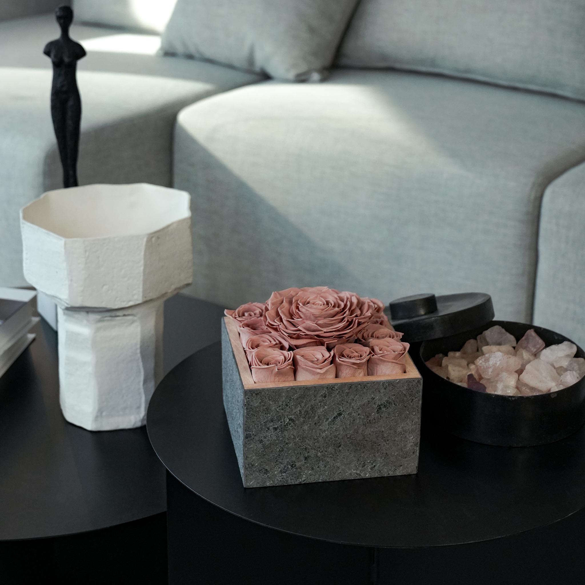 The Pāsāna Collection is an artistic confluence of three pieces of nature: a rose centerpiece, a wooden vessel and a stone facade.