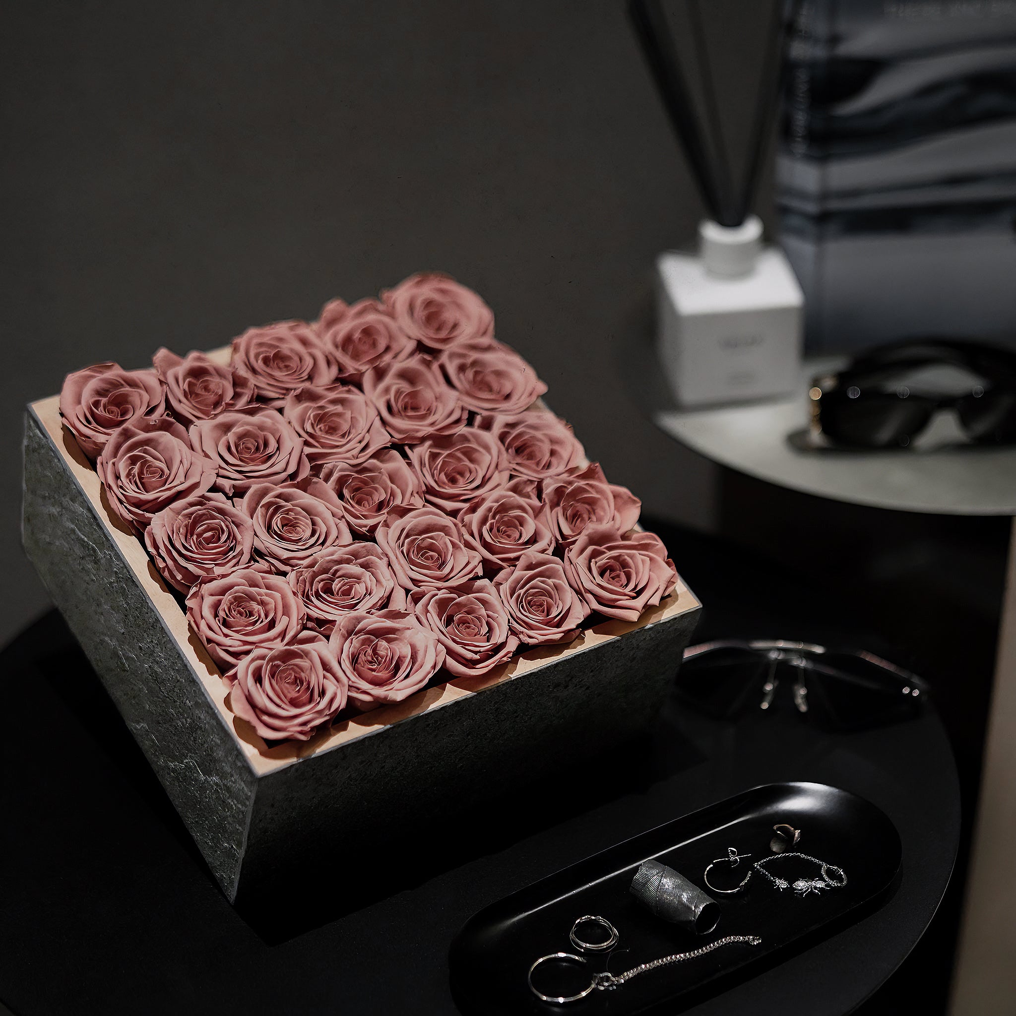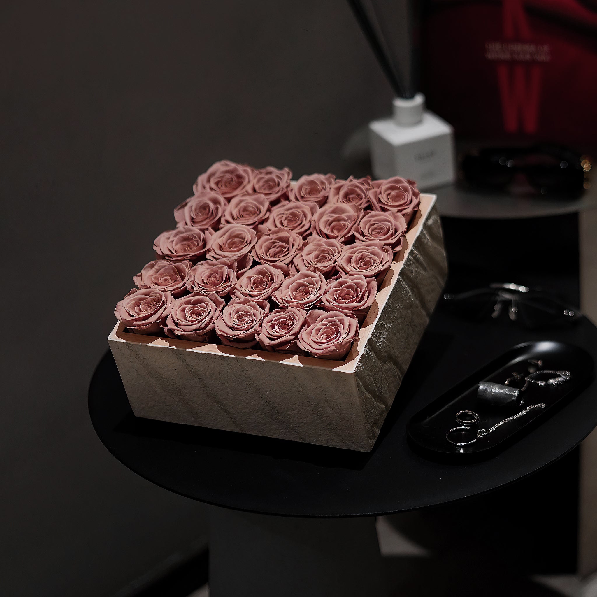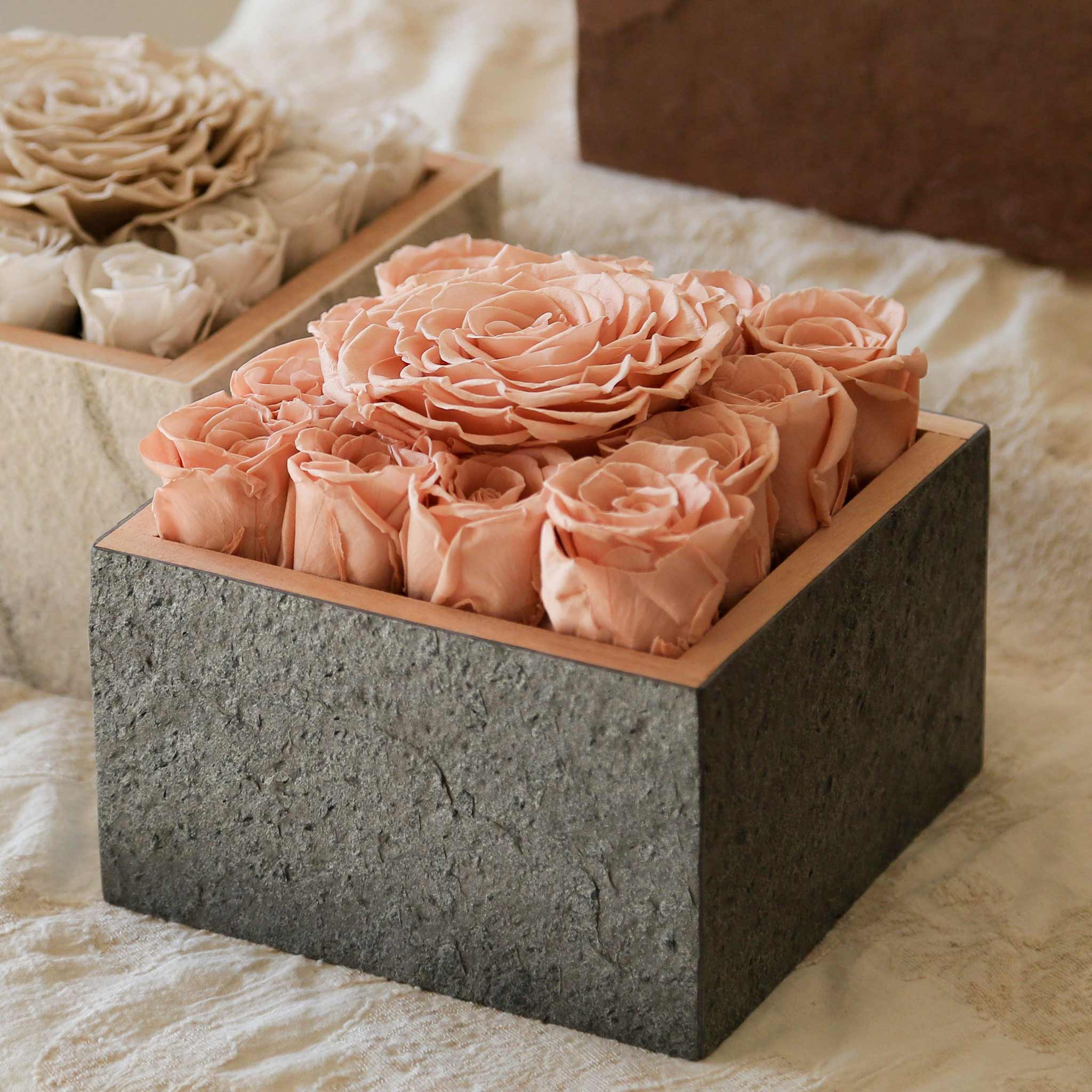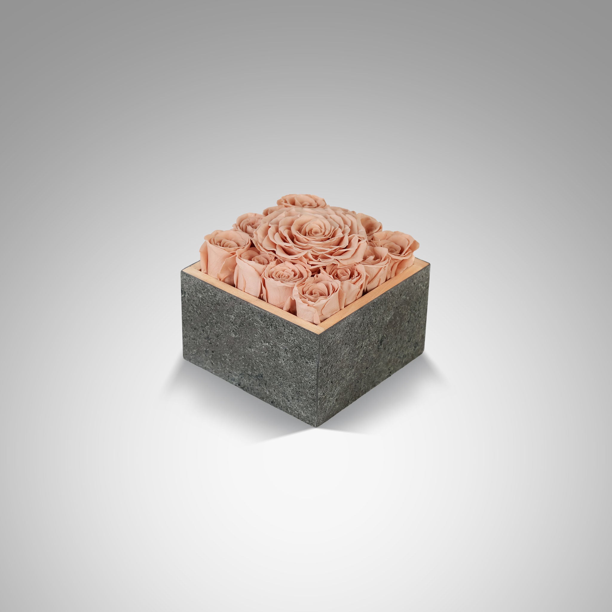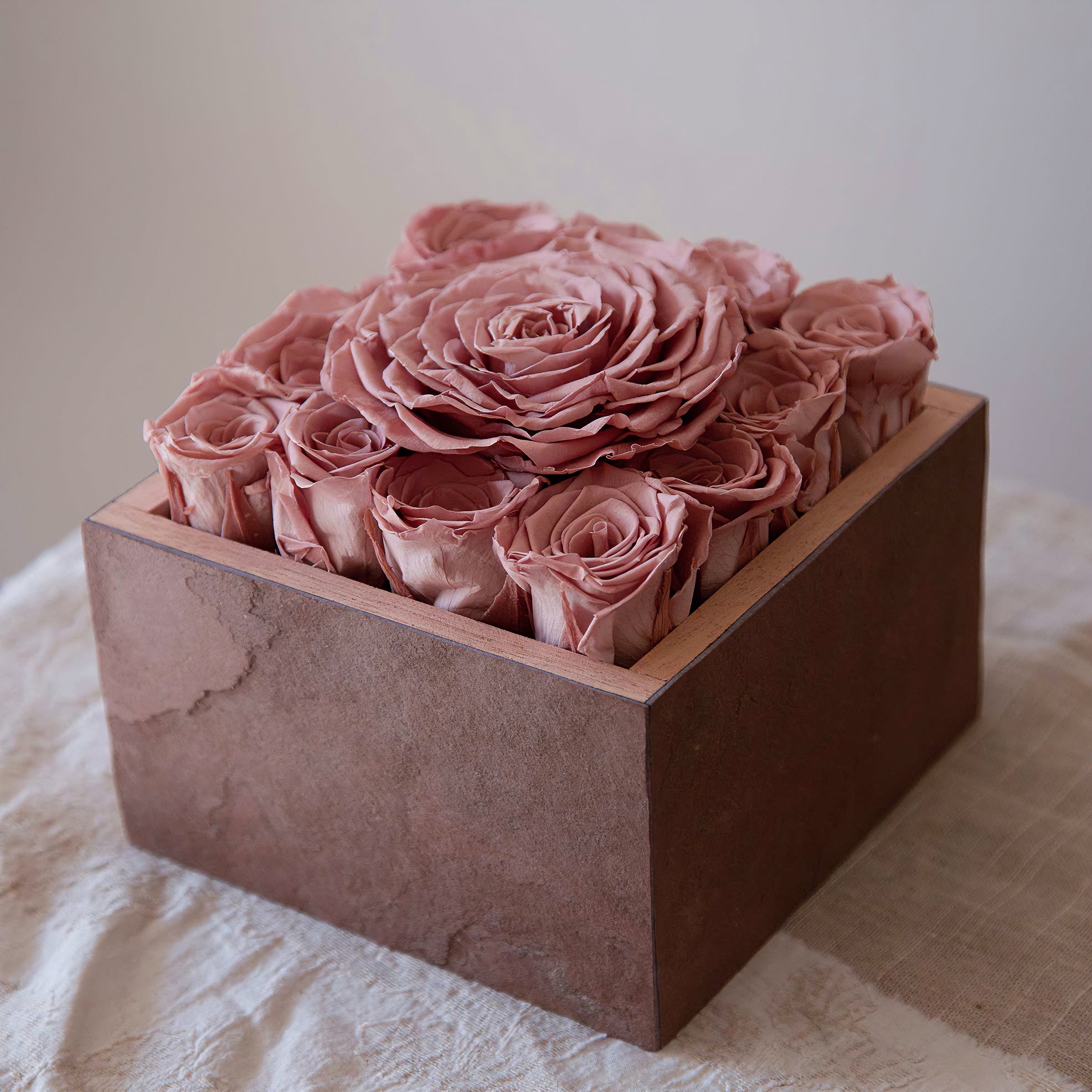 The Pāsāna Collection is an artistic confluence of three pieces of nature: a rose centerpiece, a wooden vessel and a stone facade.
