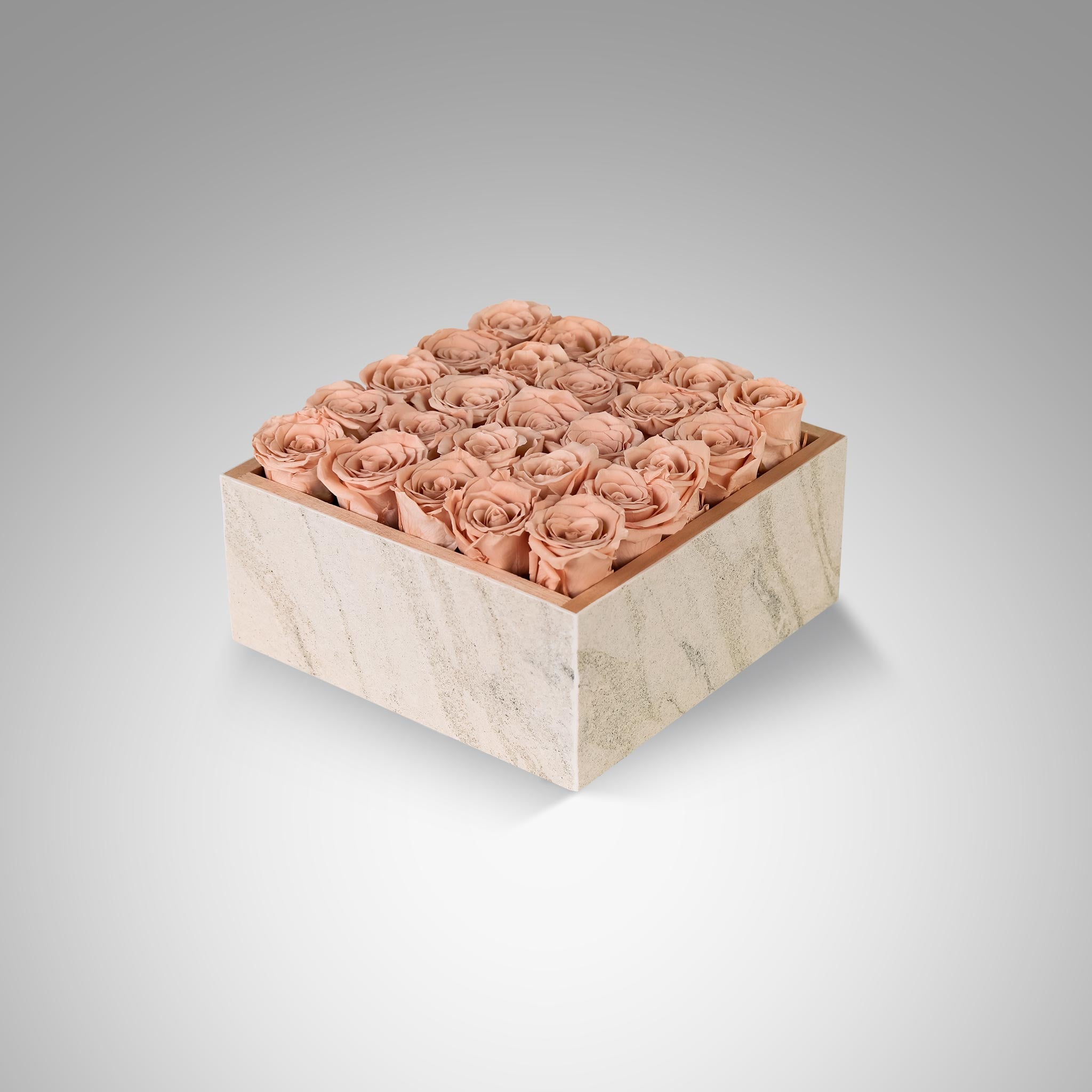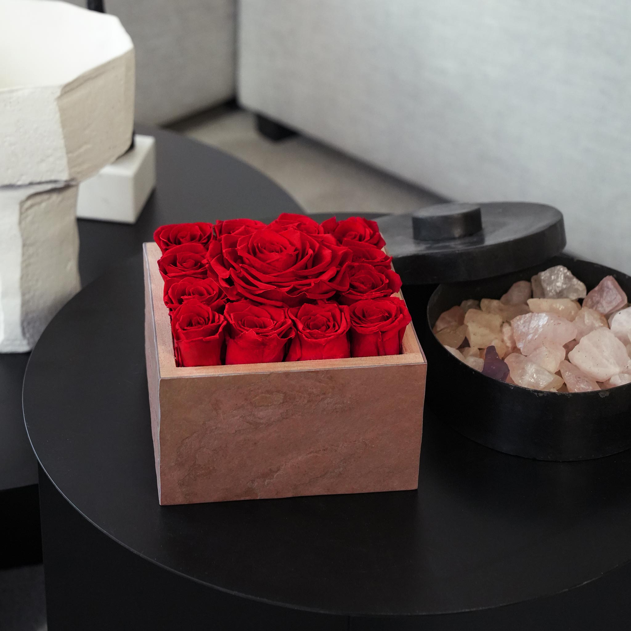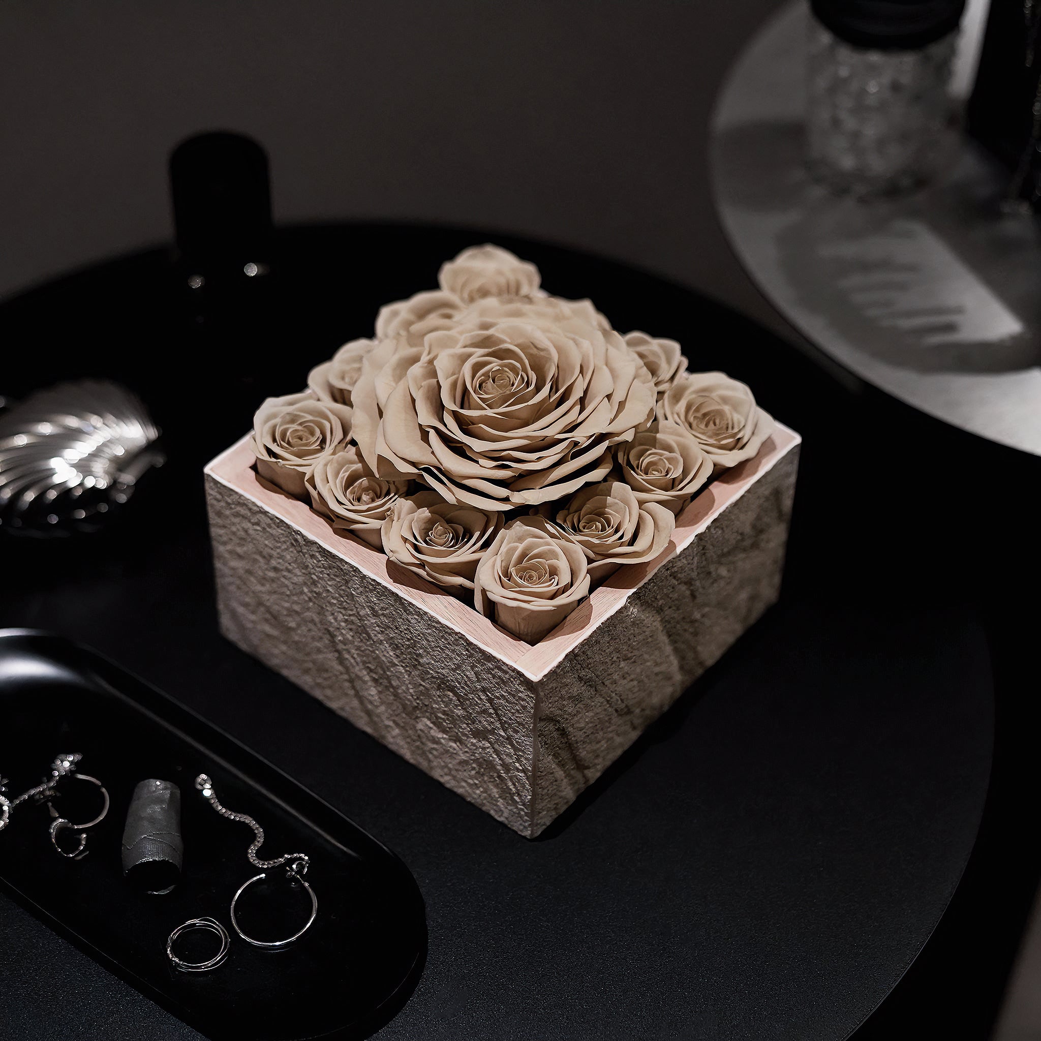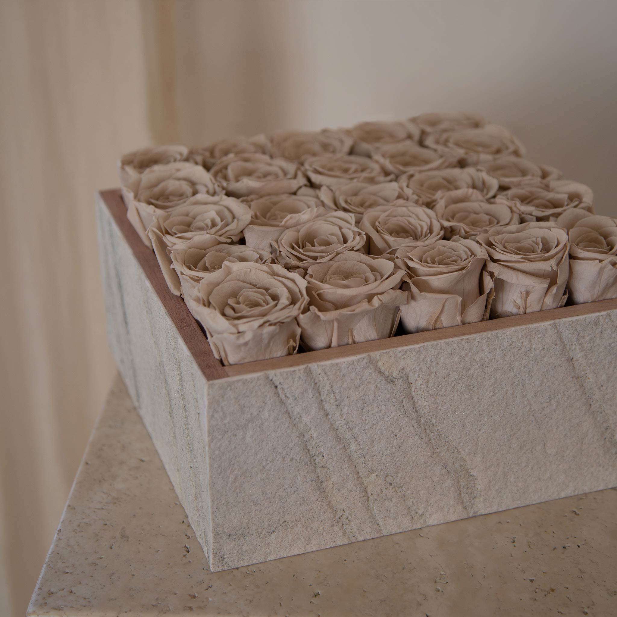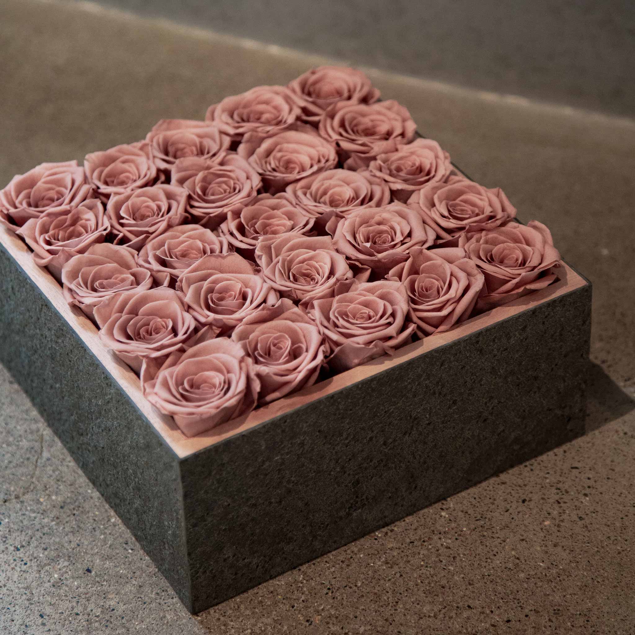 The Pāsāna Collection is an artistic confluence of three pieces of nature: a rose centerpiece, a wooden vessel and a stone facade.
