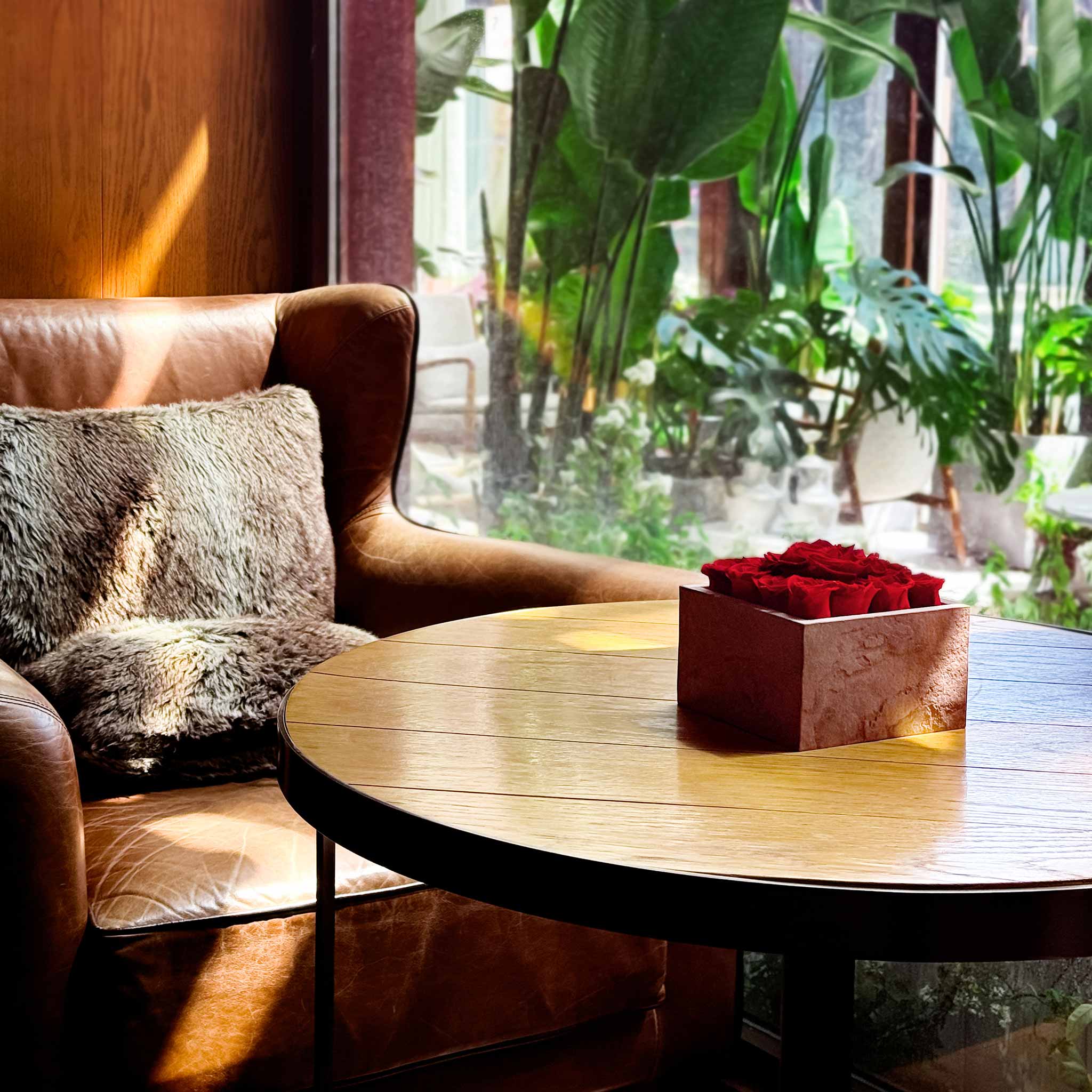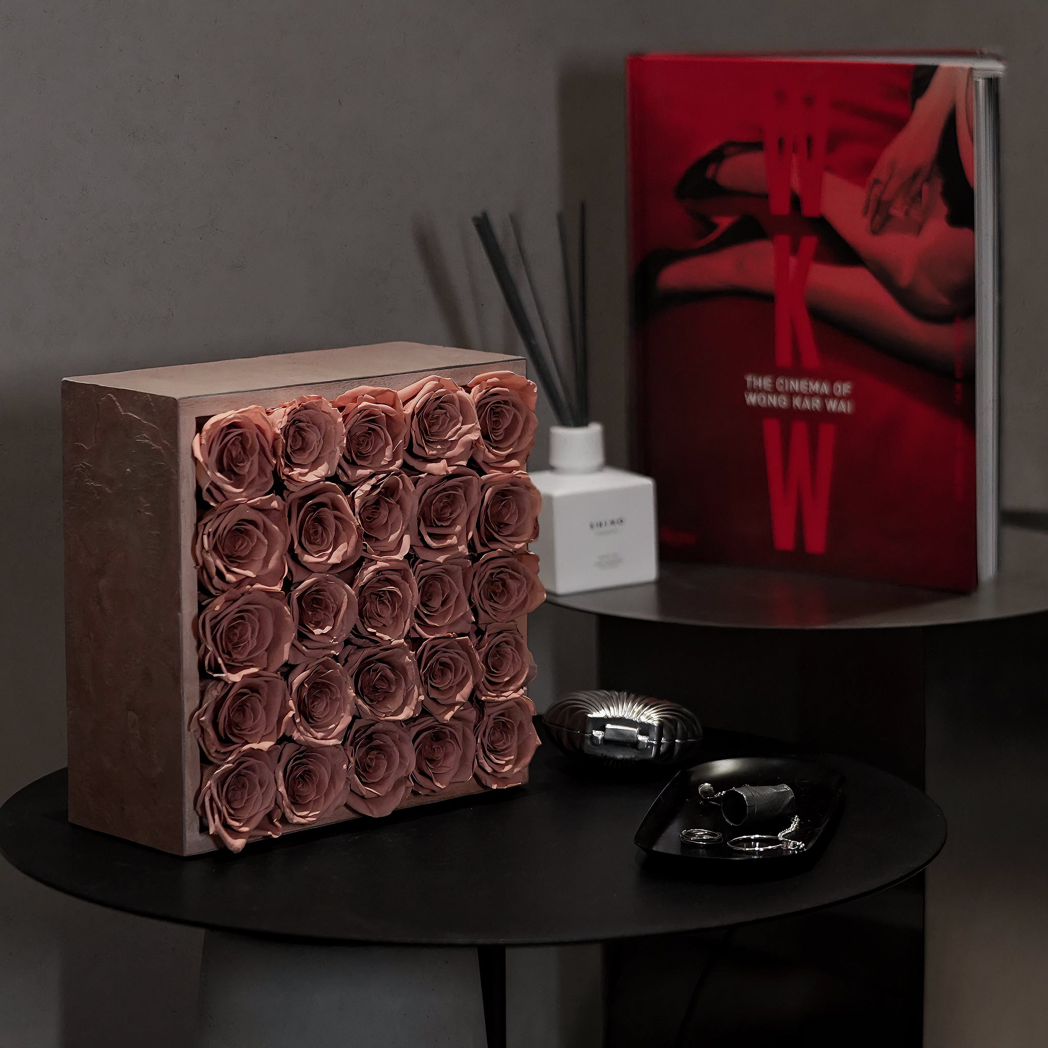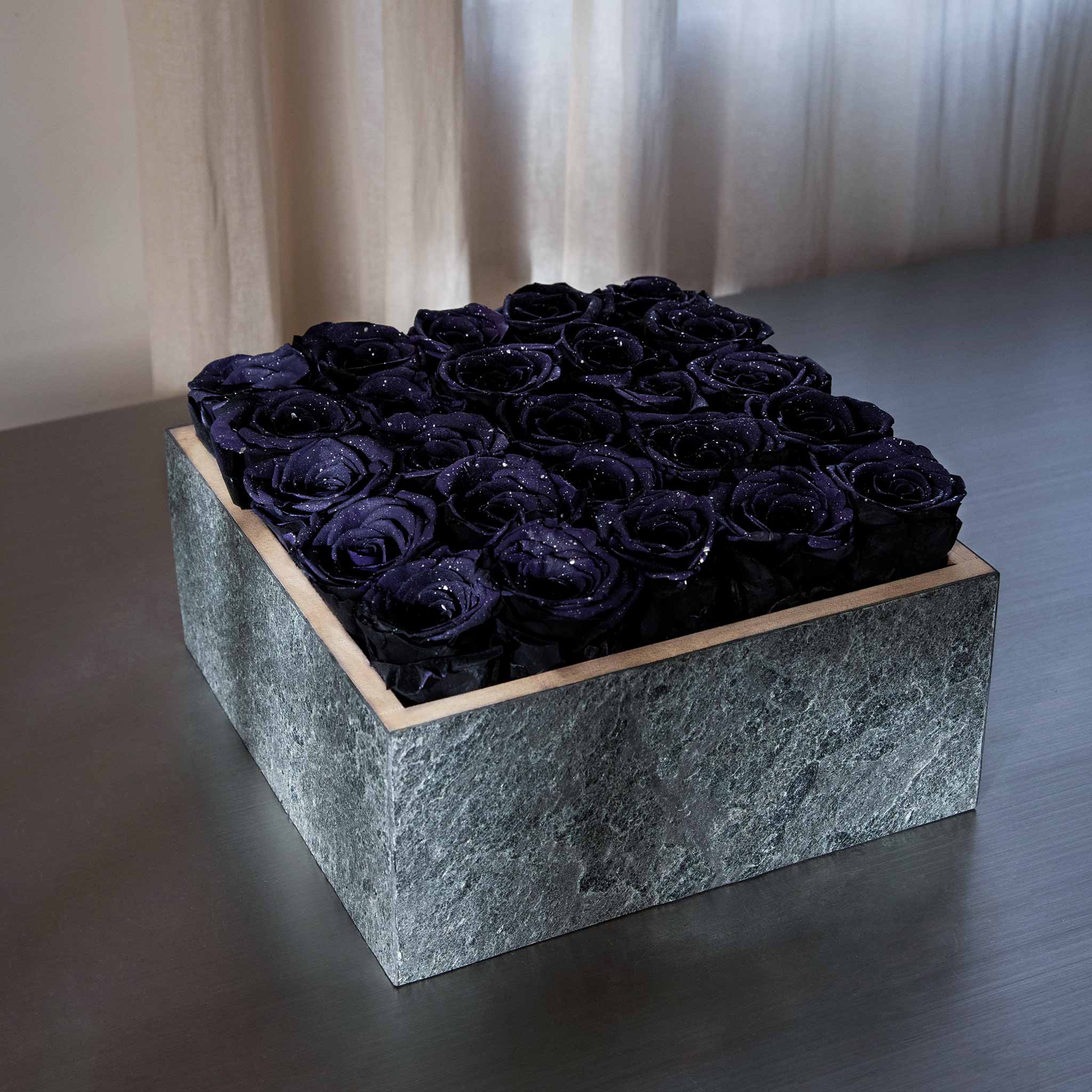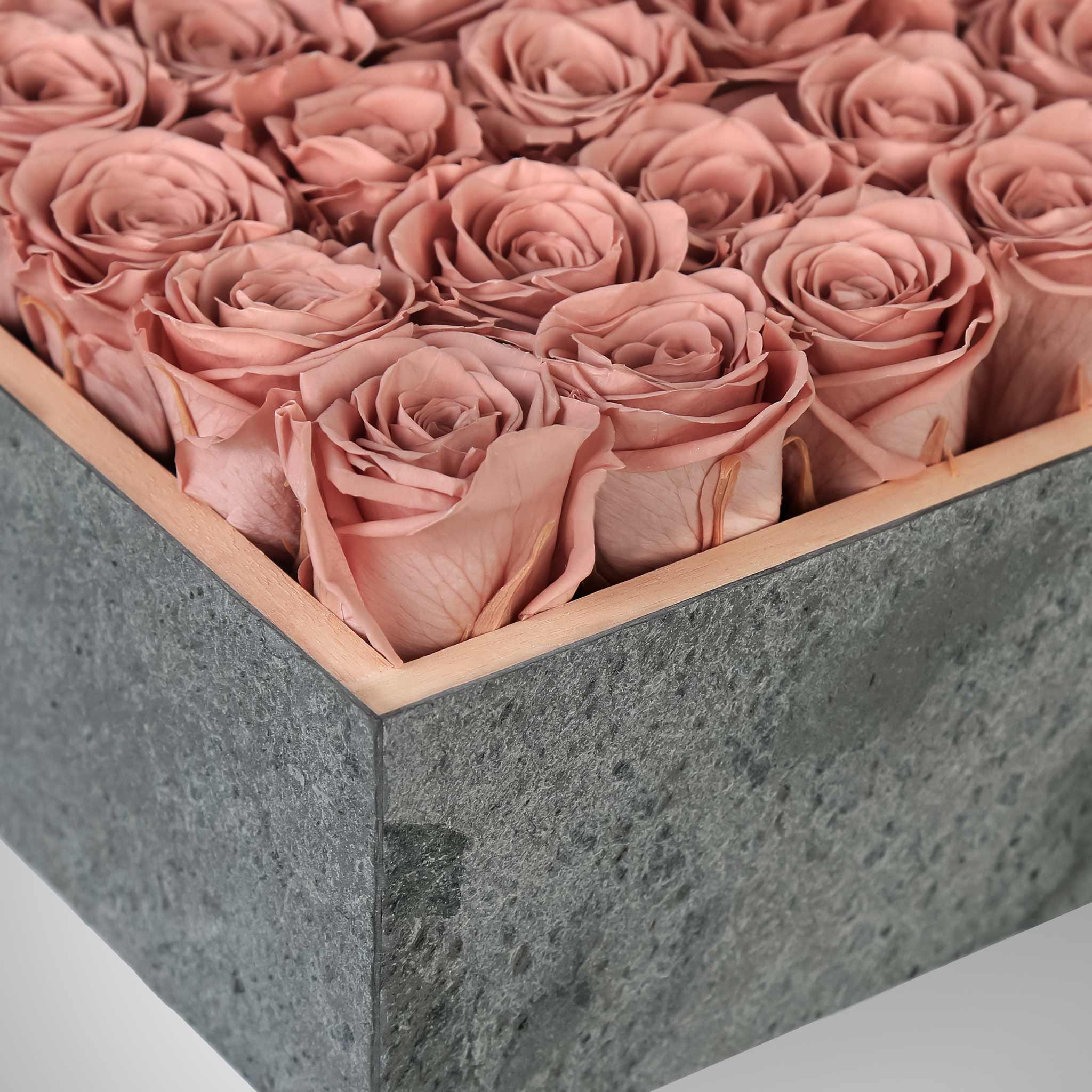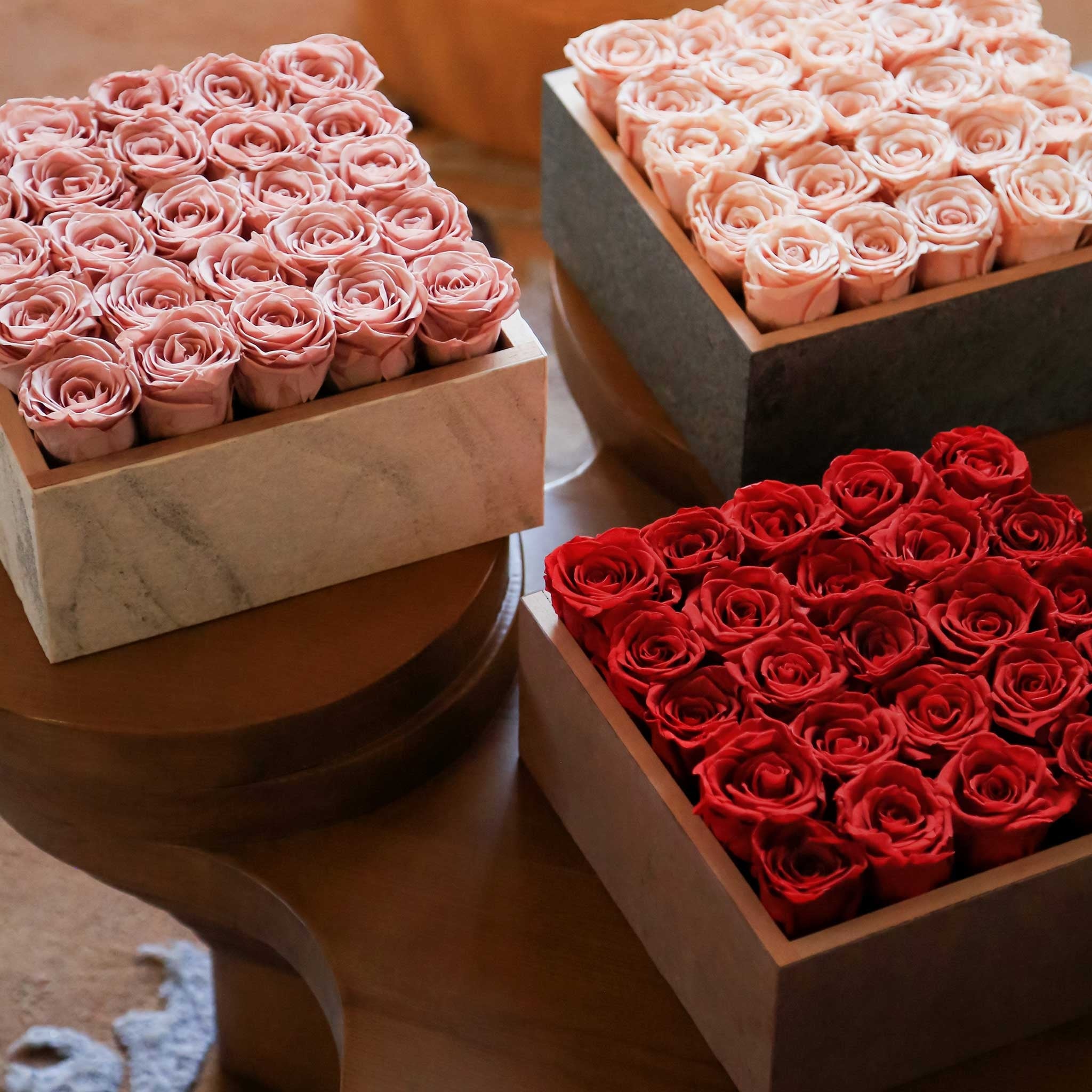 The Pāsāna Collection is an artistic confluence of three pieces of nature: a rose centerpiece, a wooden vessel and a stone facade.