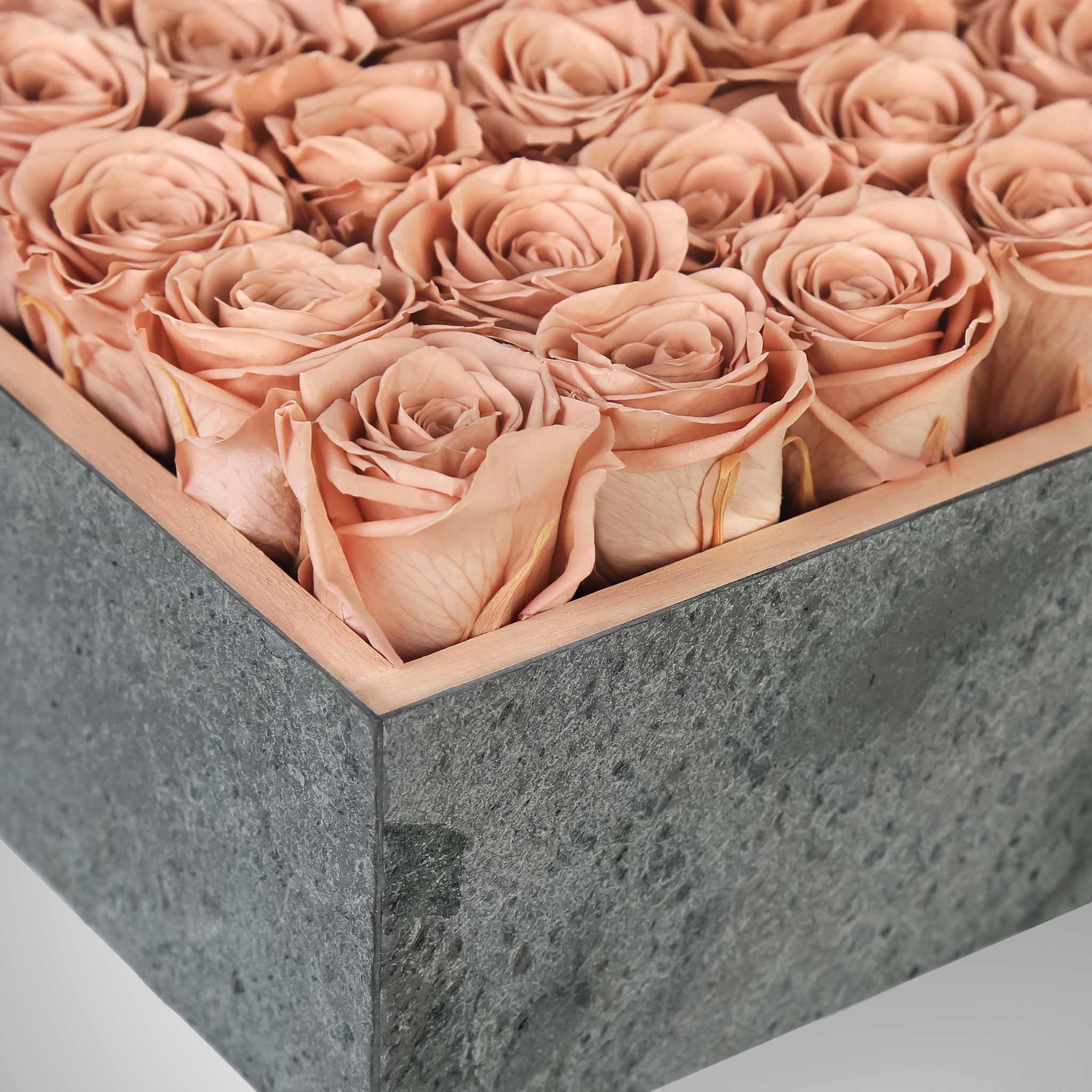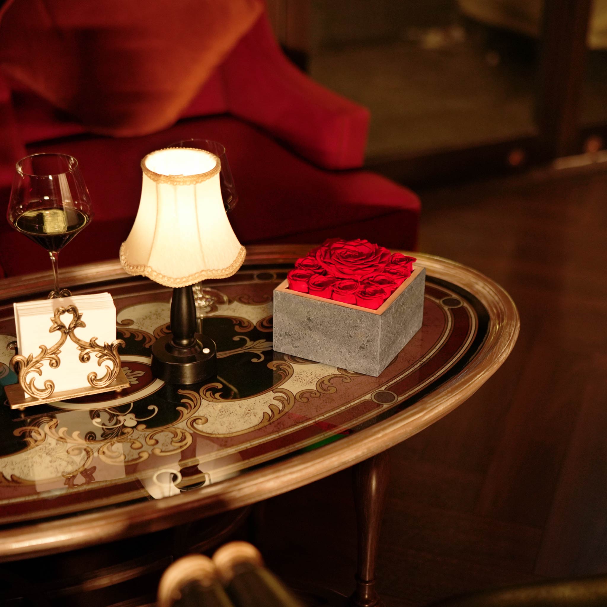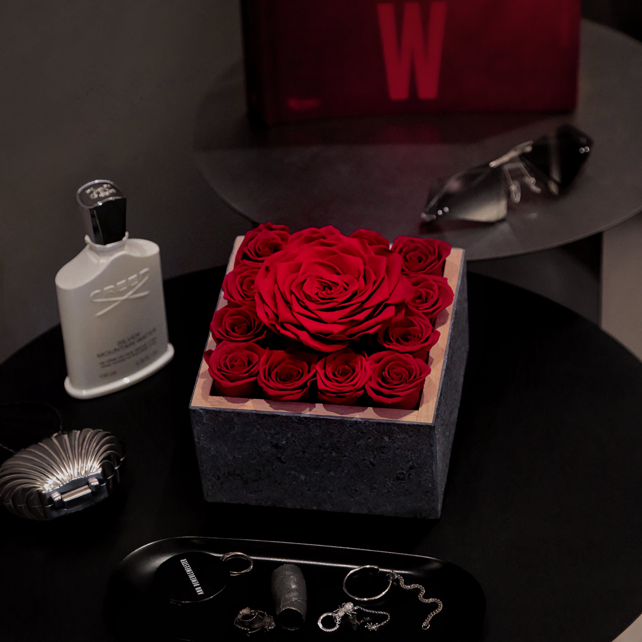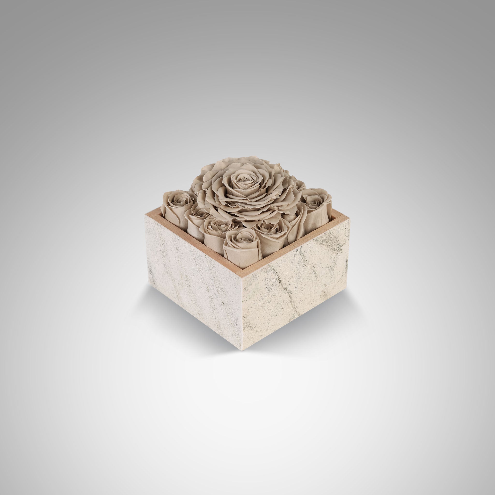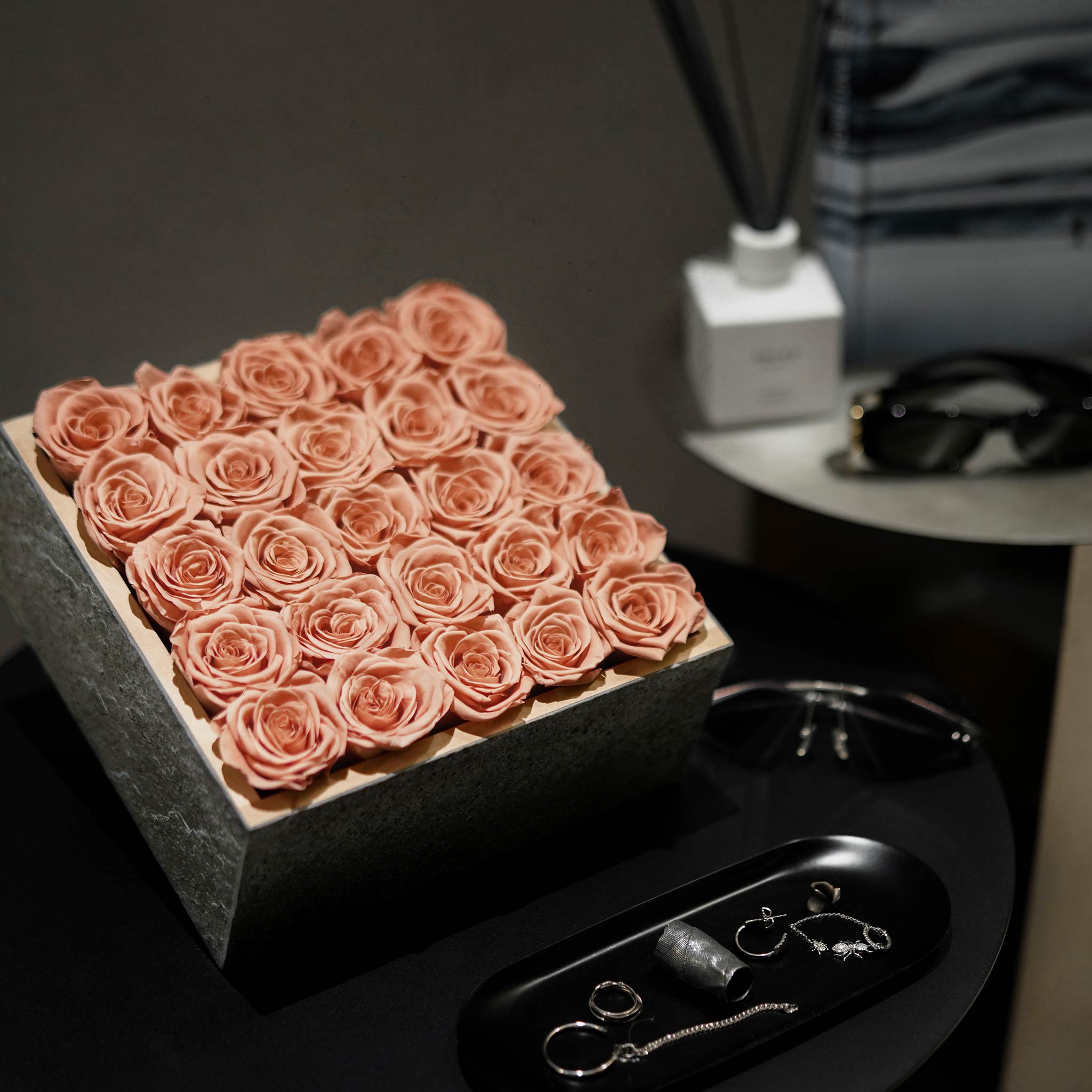 The Pāsāna Collection is an artistic confluence of three pieces of nature: a rose centerpiece, a wooden vessel and a stone facade.