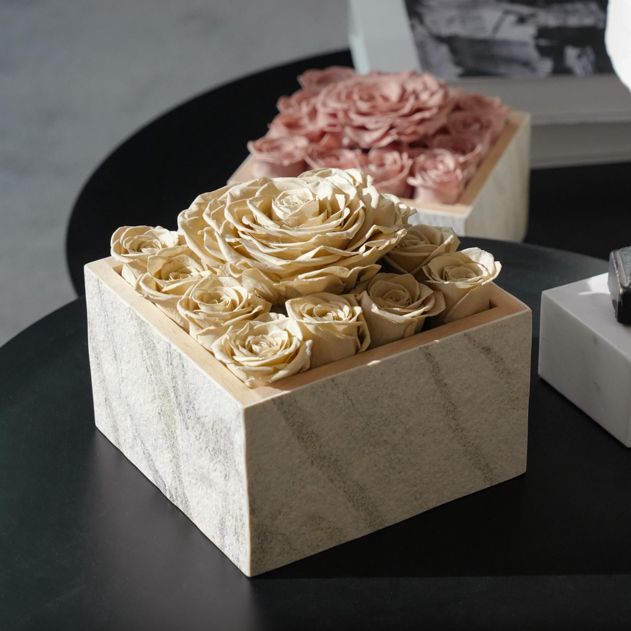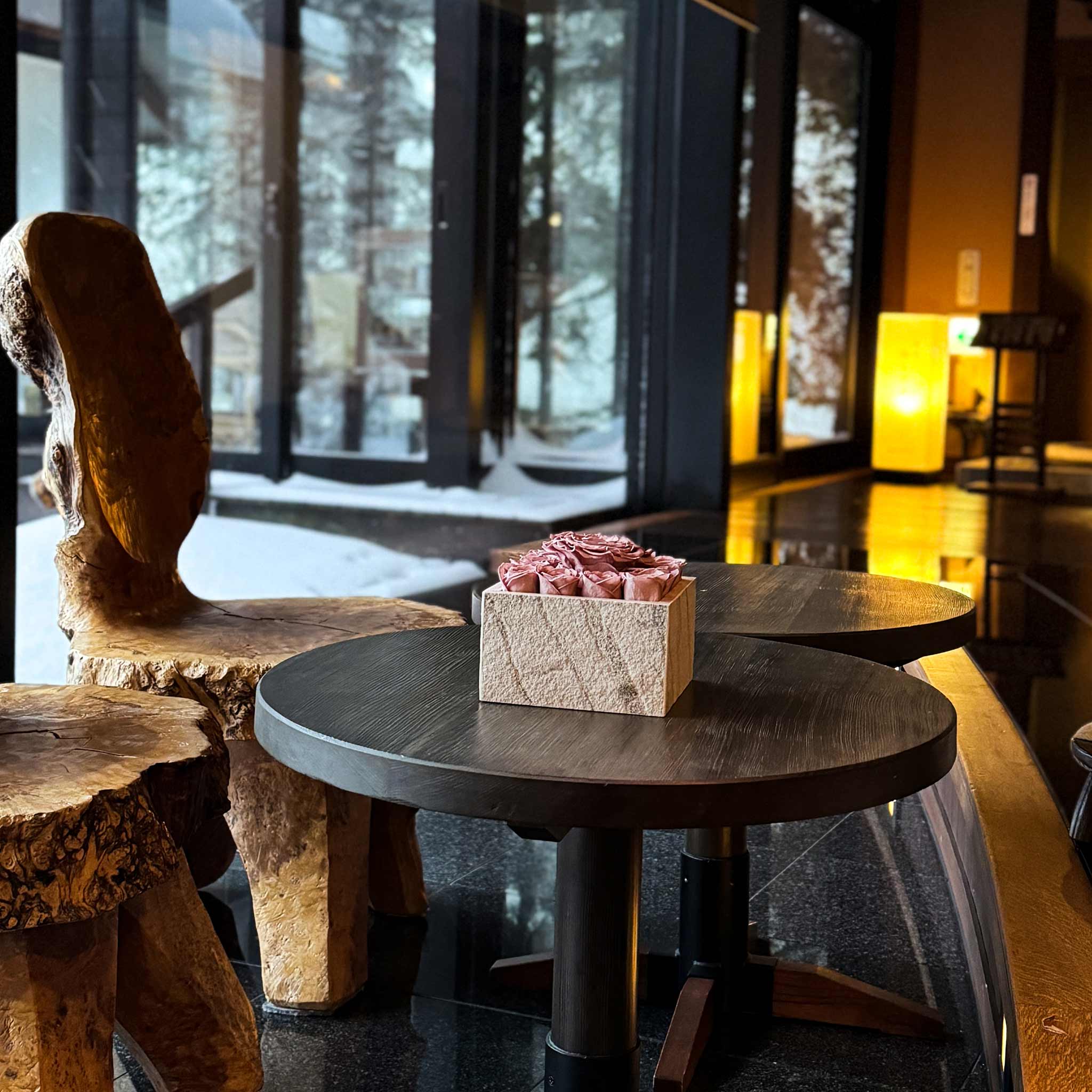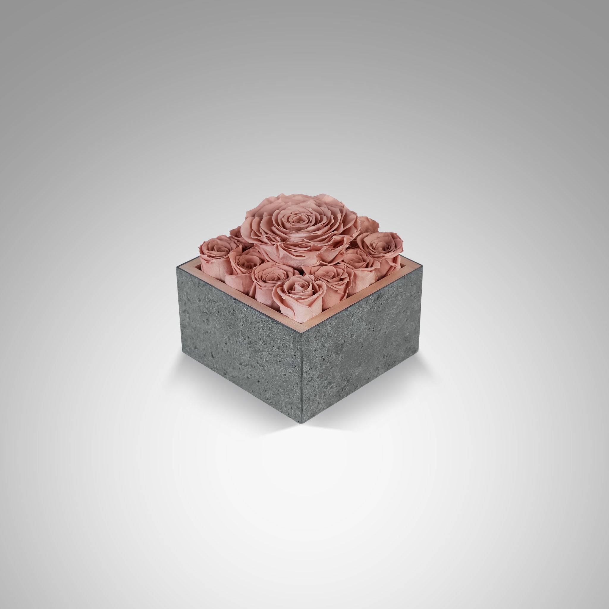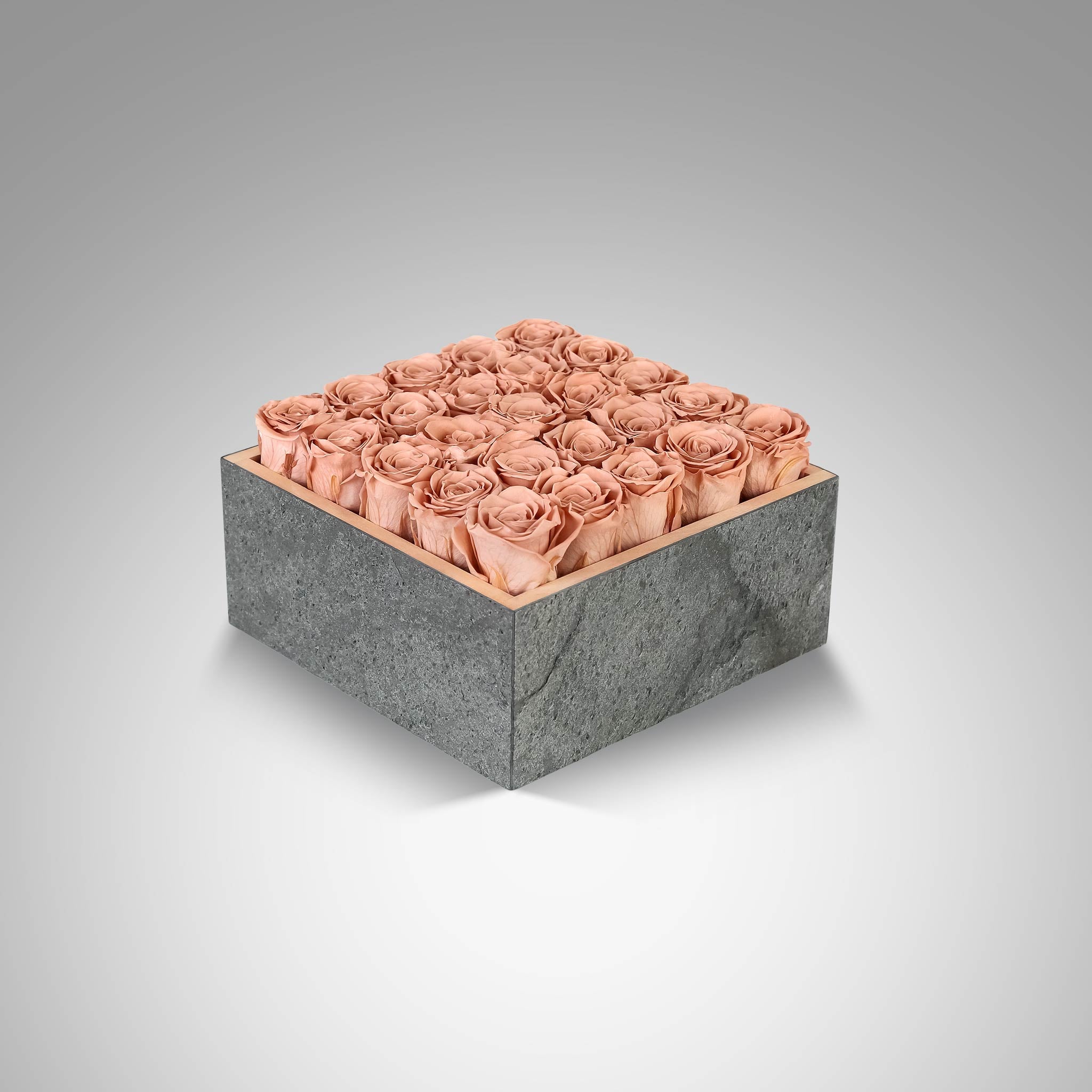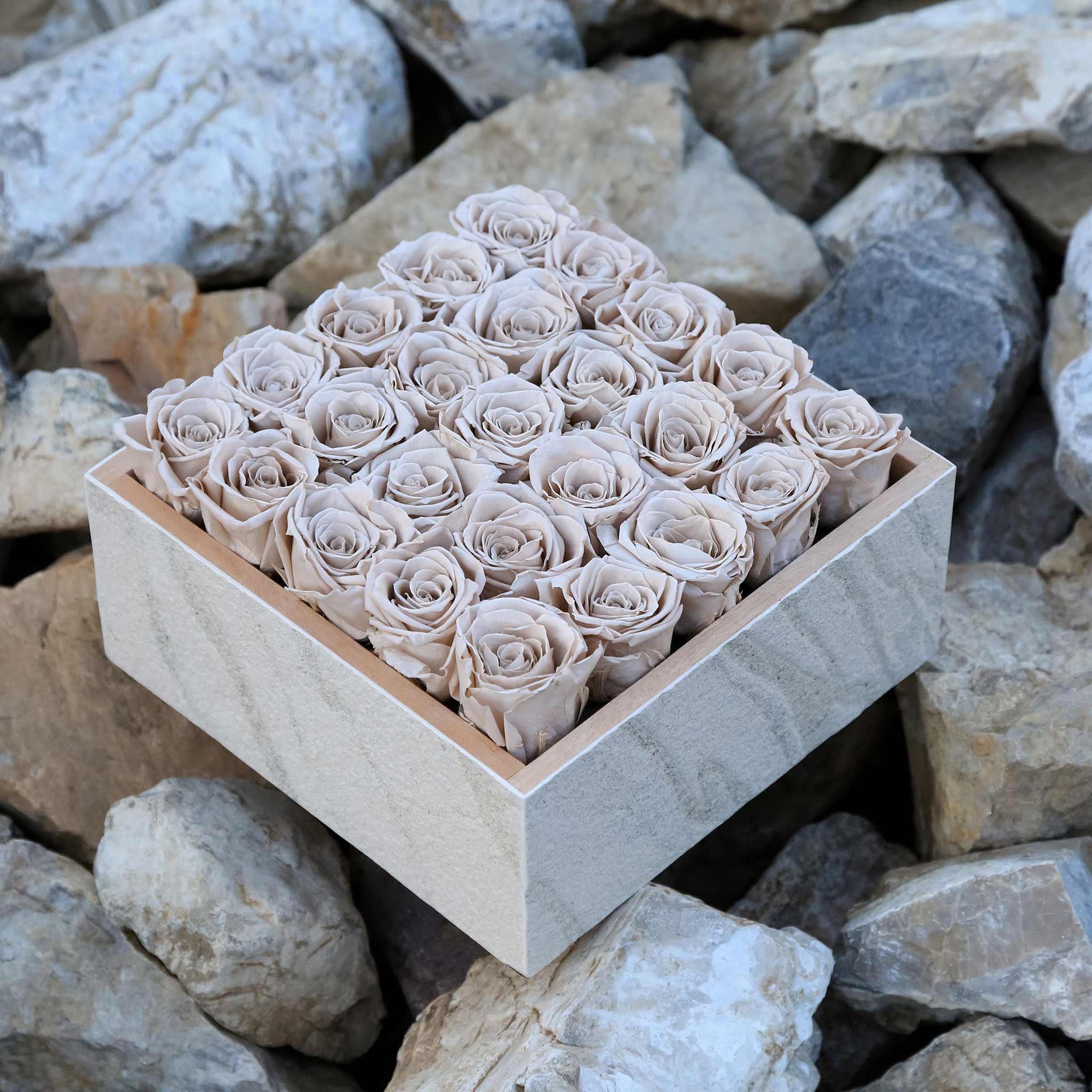 The Pāsāna Collection is an artistic confluence of three pieces of nature: a rose centerpiece, a wooden vessel and a stone facade.
