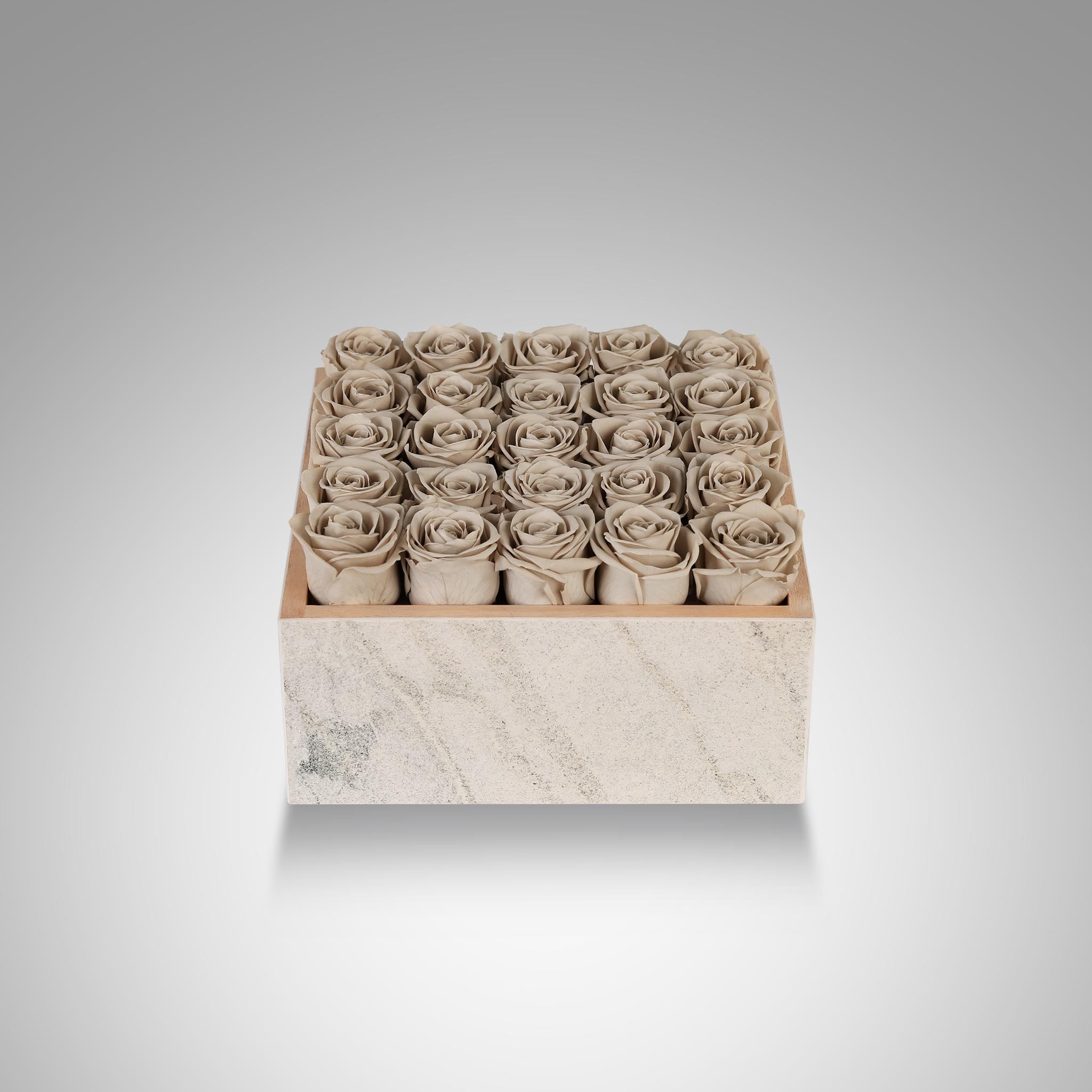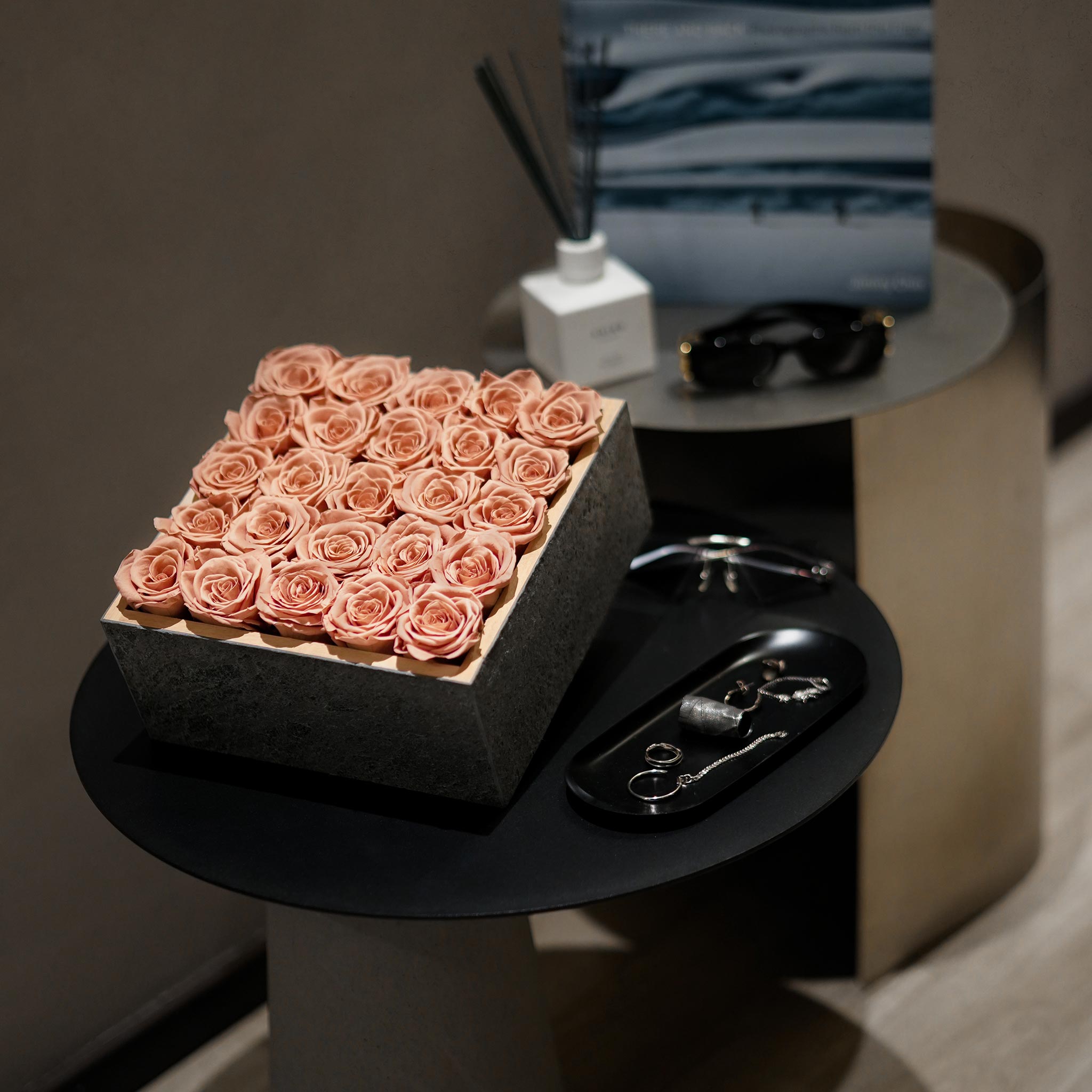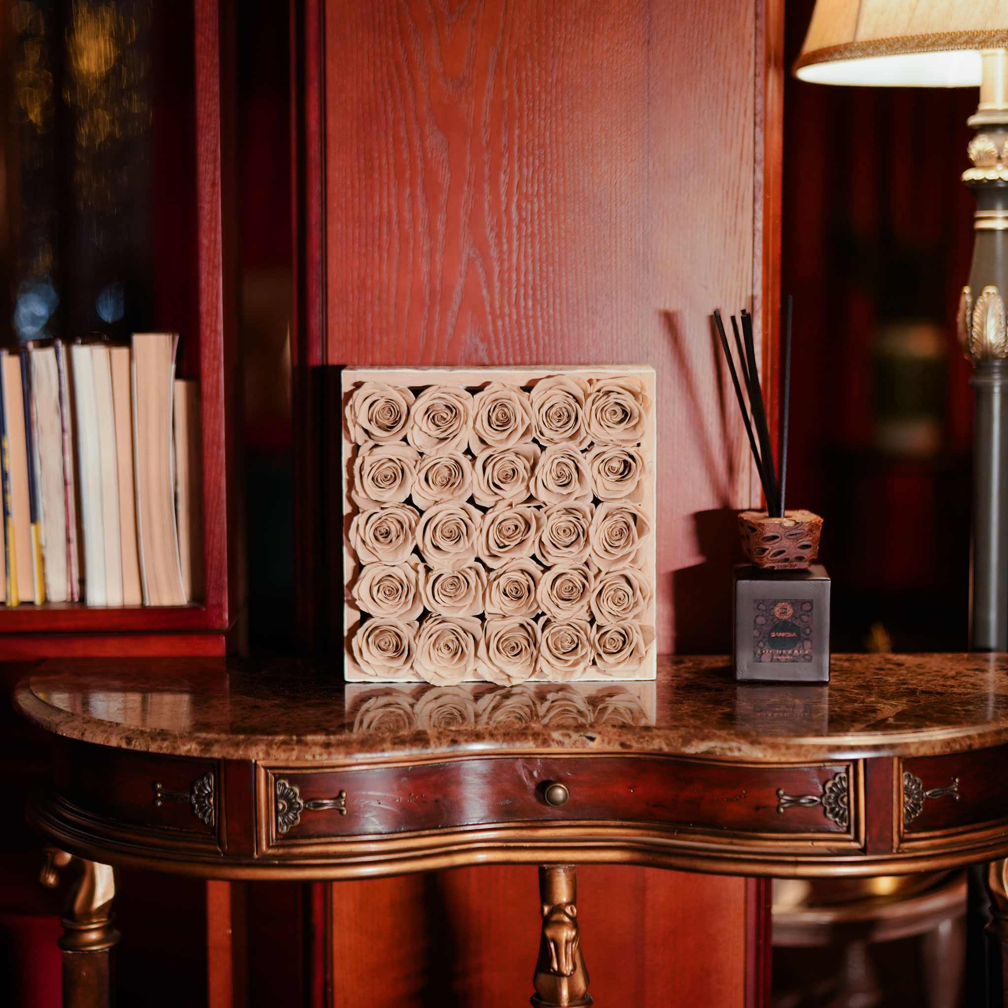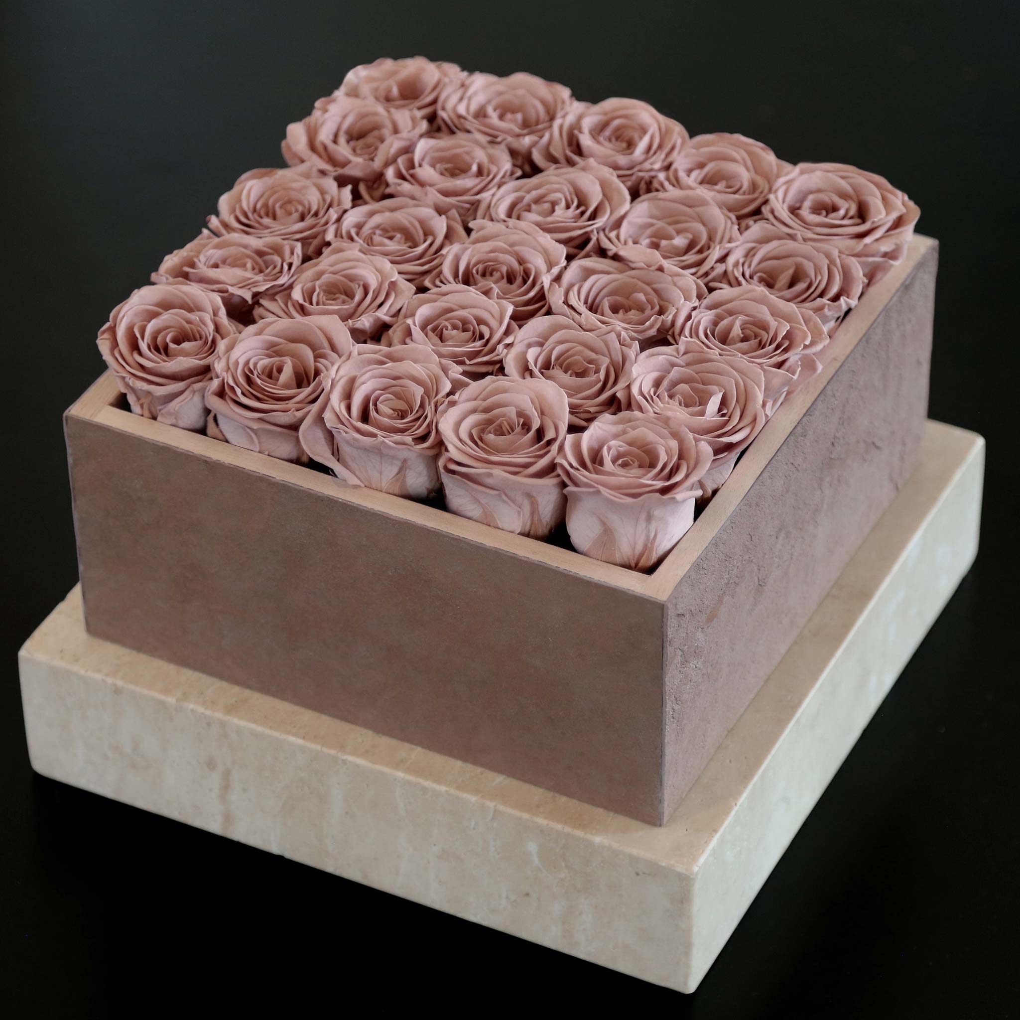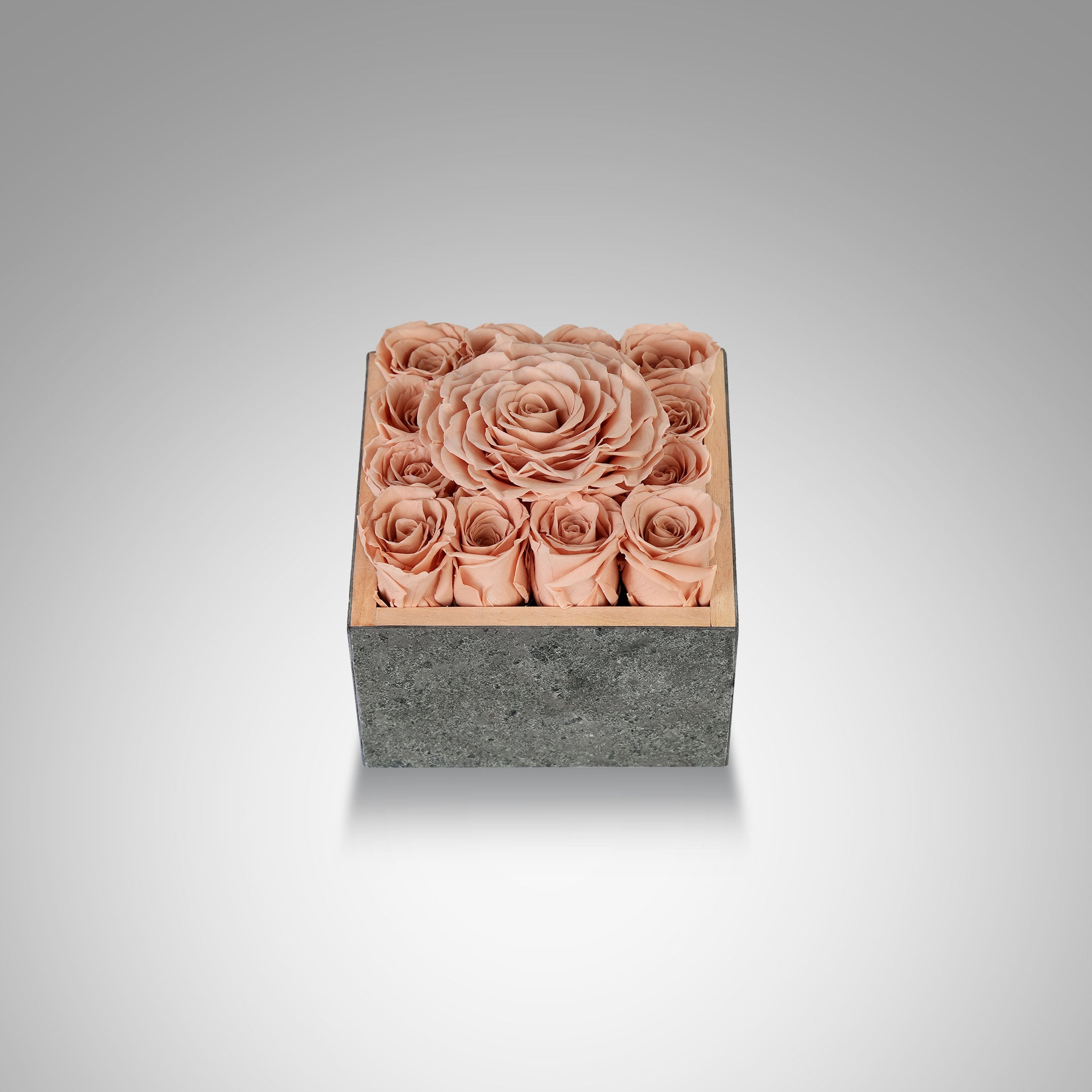 The Pāsāna Collection is an artistic confluence of three pieces of nature: a rose centerpiece, a wooden vessel and a stone facade.
